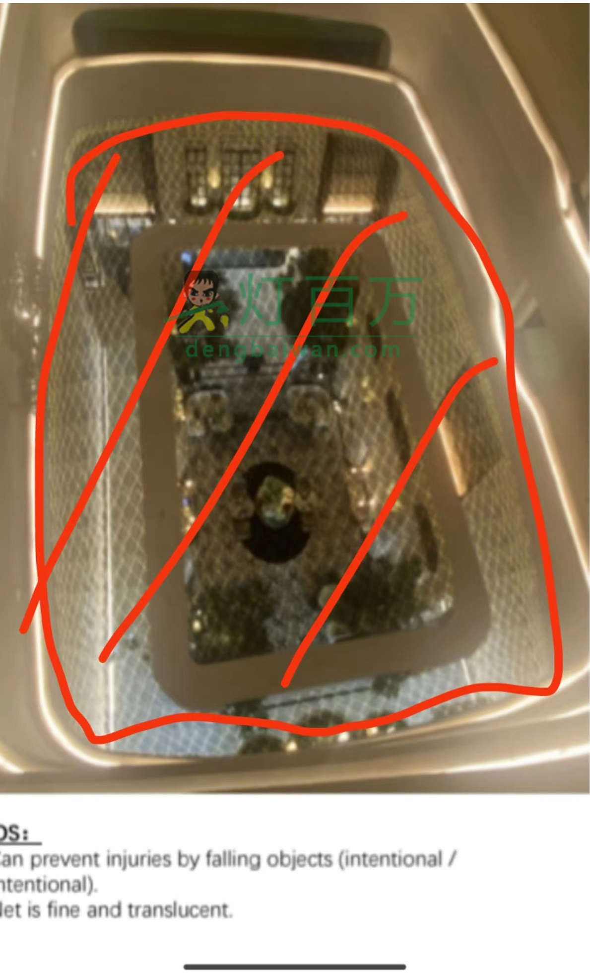 深圳市南山香格里拉酒店安装隐形防护网工程。大型灯饰、吊饰安装安全网已经成为业界标准,灯百万拥有一支专业的灯具安装、清洗服务团队,提供快速的报价咨询,出具方案和施工图。洗灯、修灯、装灯一条龙服务。